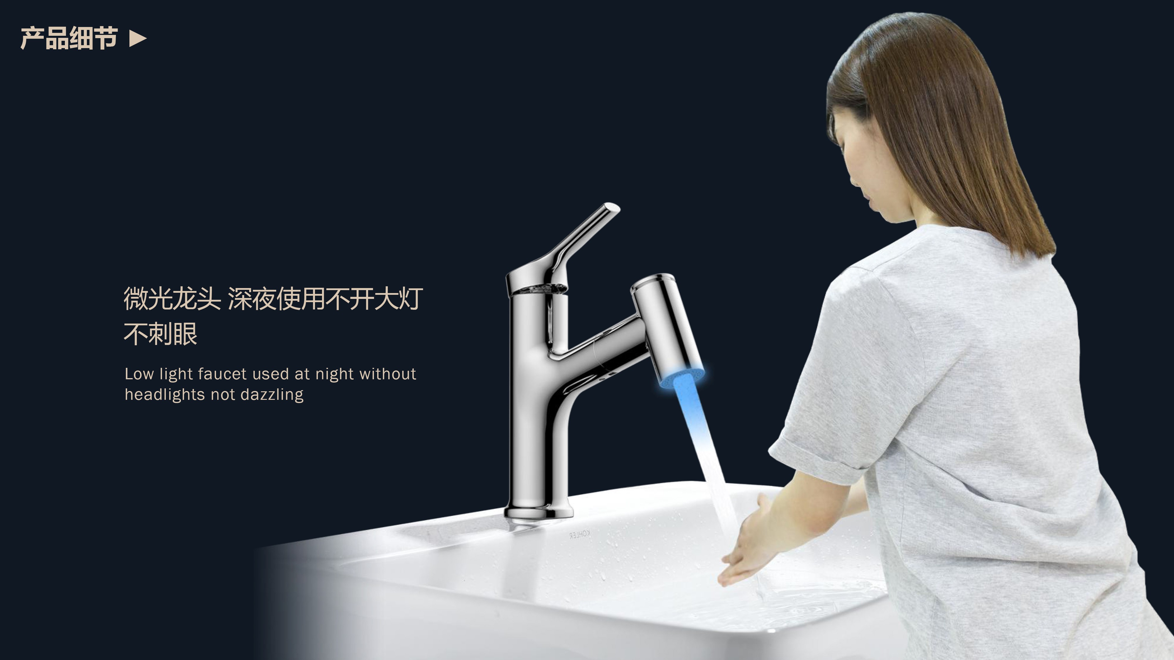 360°全方位抽拉清洗;微光龍頭,深夜使用不開大燈,不刺眼;日常洗頭利器,抽拉出水輕松洗;按壓切換兩功能水花;三種顏色LED燈光顯示水溫;重力錘復位設計,順暢伸縮,精準回位;無需工具,一推一擰10秒快裝